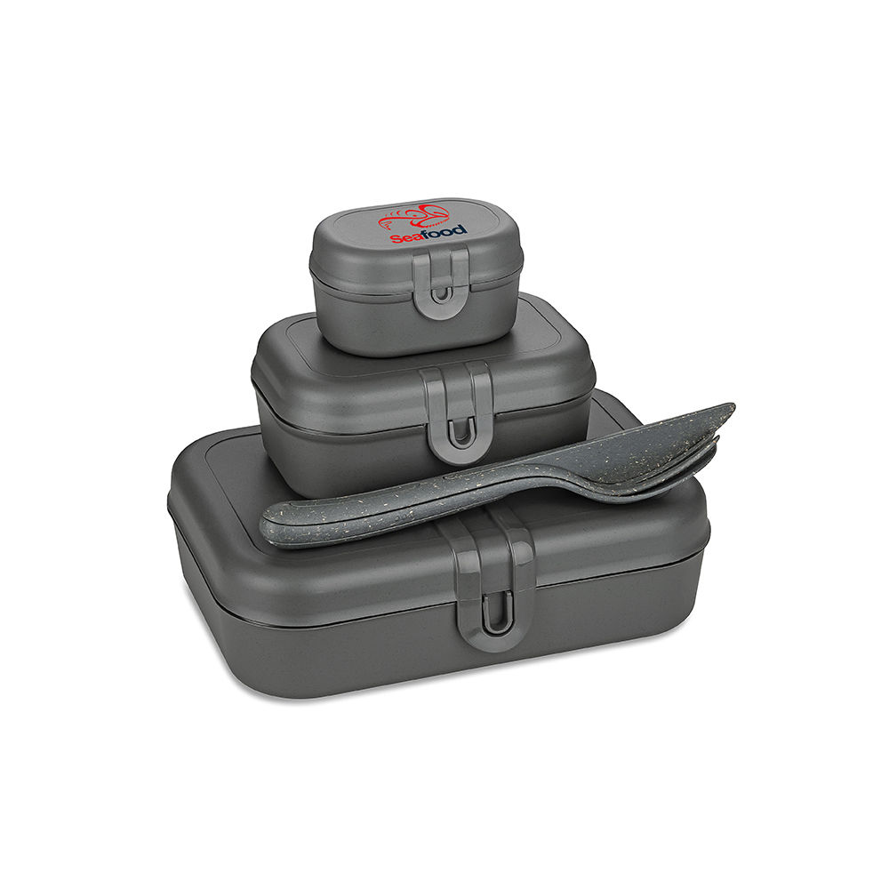 Bei dieser geräumigen Lunchbox mit Clipverschluss wurde an alles gedacht. Obst, Salate & vieles mehr finden im geräumigen Inneren ihren Platz und können in den zwei integrierten kleinen Boxen verstaut werden, die auch separat genutzt werden können. Messer, Gabel und Löffel können besonders platzsparend ineinandergesteckt werden. Natürlich sind alle Bestandteile spülmaschinengeeignet. Der Markenwerbeartikel aus dem Hause KOZIOL stammt aus der Organic Collection. Alle Artikel dieser ökologischen Werbeartikel-Serien enthalten natürliche Zellulose und weisen weder Melanin, Formaldehyd noch BPA auf. Zugleich sind die Thermoplast-Produkte extrem langlebig und absolut unempfindlich gegenüber Hitze - bis mindestens 100 Grad, sowie gegen Brüche oder Splittern. Ein weiterer Pluspunkt: die Herstellung in Deutschland ermöglicht eine aktive Reduktion von CO² durch Vermeidung von langen Transportwegen und den Einsatz von Ökostrom.